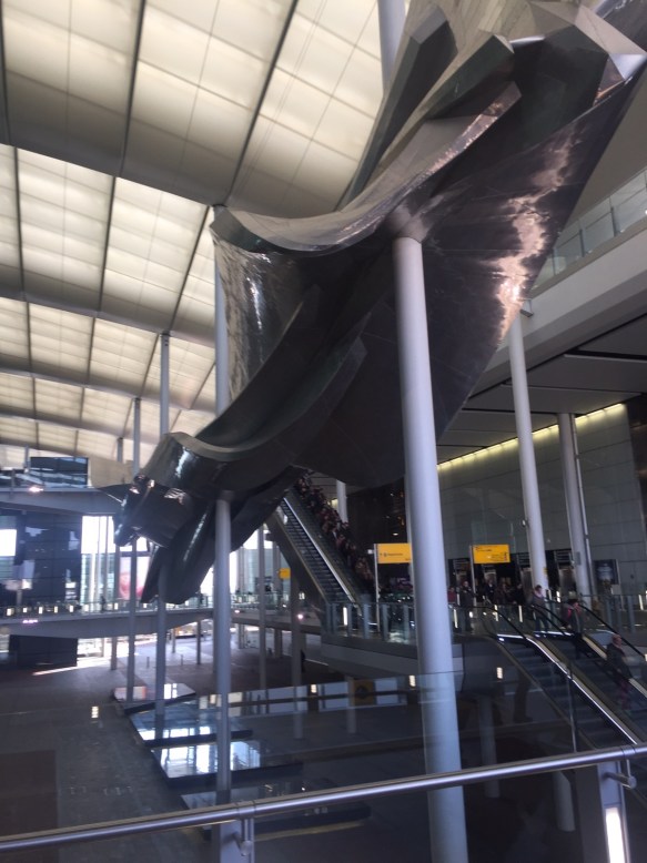 Heathrow Airport is rebuilding some of its older terminals. The newest of these is currently terminal 2, known as the Queen’s Terminal. It hosts mainly European airlines. We flew out with Swiss airlines, which had the most comprehensive self check in process – you even have to tag your own check in baggage